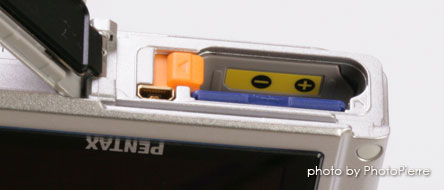 底部からメモリーカード(SDカード)や電池を入れる部分があります。簡単な機構ですがロックされているので、ちょっとひっかけただけでは開きません。実際の開閉に少々不便を感じないこともないですが、それよりも防水防塵の安全性が優先でしょう。それほど頻繁に開閉する部分でもないので。