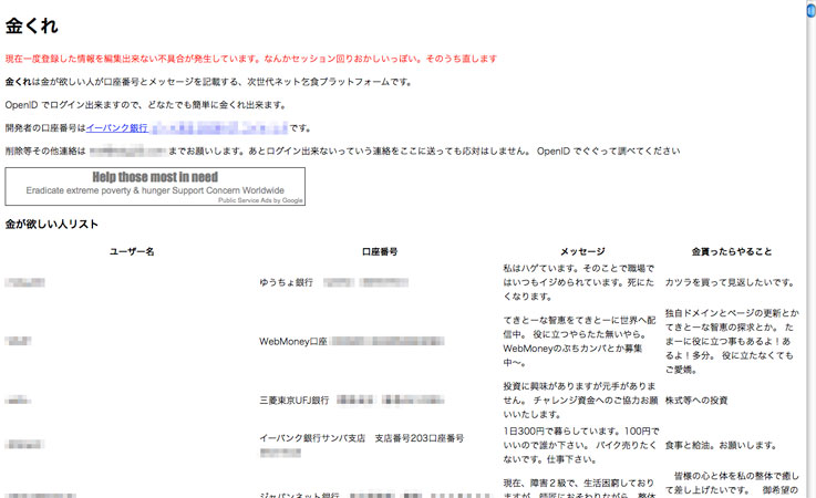 金を振り込んで欲しいヒトが口座番号やその理由などを公開するサイト登場! こりゃおもしろいけれども、振り込む詐欺に有効活用できそうです。