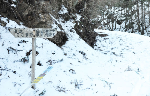 5号橋まで来れば、「象ヶ滝0.4K」の道標があり、すぐそこです。雪が無ければ10分くらいの道程ですが、雪があっても10分くらいでした!