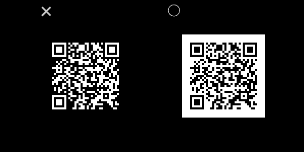 いくら再現性の高いQRコードとはいえ、例示の左側のように、コードを反転してもまず読み取れませんので、右側のように白背景(クワイエットゾーン)をつけるのが正しい表示方法です。これは2次元コードに限らず、1次元のバーコード等でも同じです。