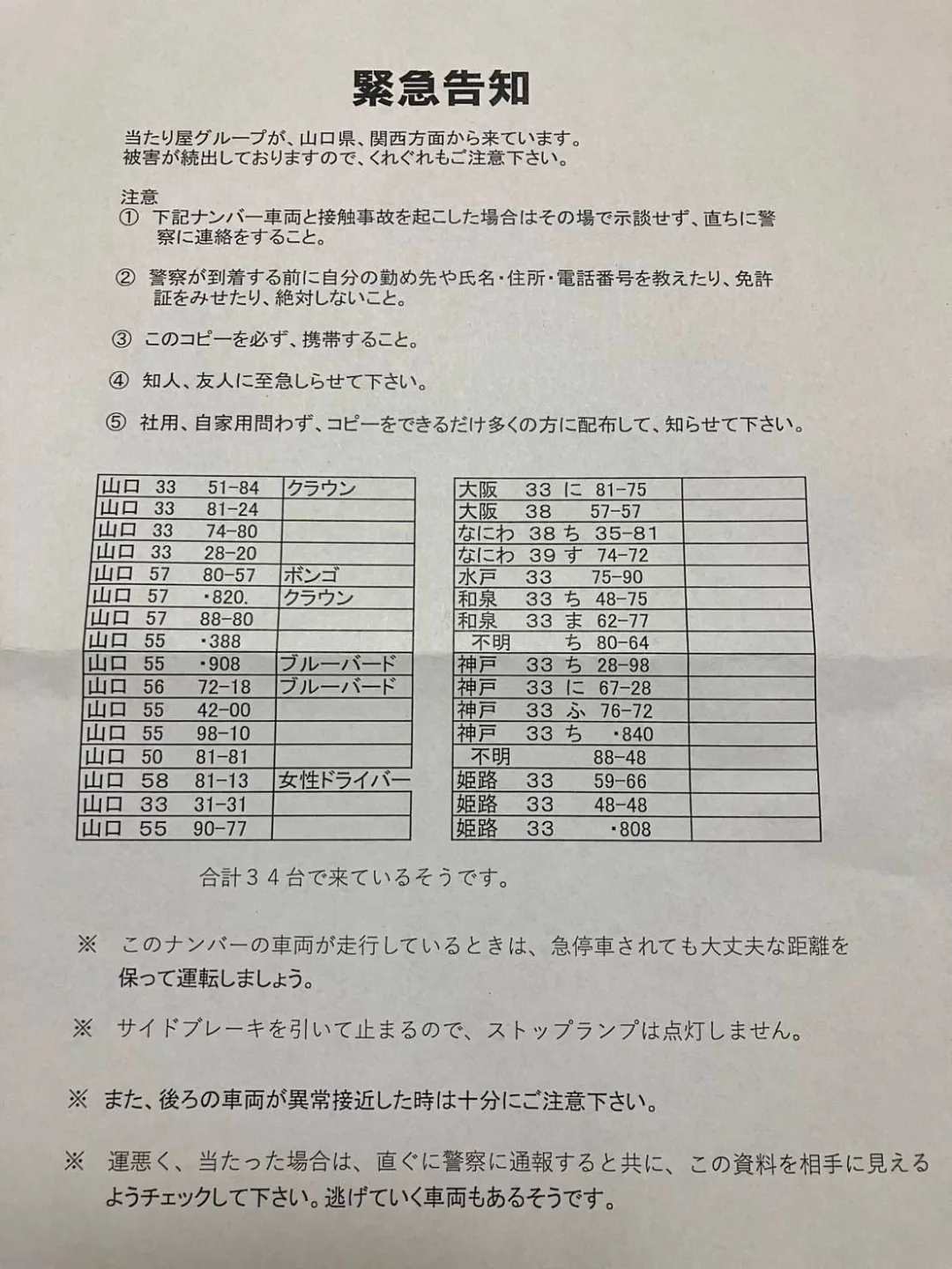 さすがに昭和の頃までは知らないが、平成に改元された頃にはすでにFAXで出回っていた【当たり屋情報】。三十数年前には自動車交通関係の仕事をしていたので、事務所の壁に貼り出されたことも記憶している。