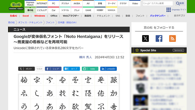Googleが開発を進めているフォントNotoは、現存する文字をすべてに対応しているとするUnicodeすべてを登録したと豪語していた。これについて、日本ではすでに人名か蕎麦屋の看板くらいにしか用いられなくなった変体仮名にも対応が完了したという。