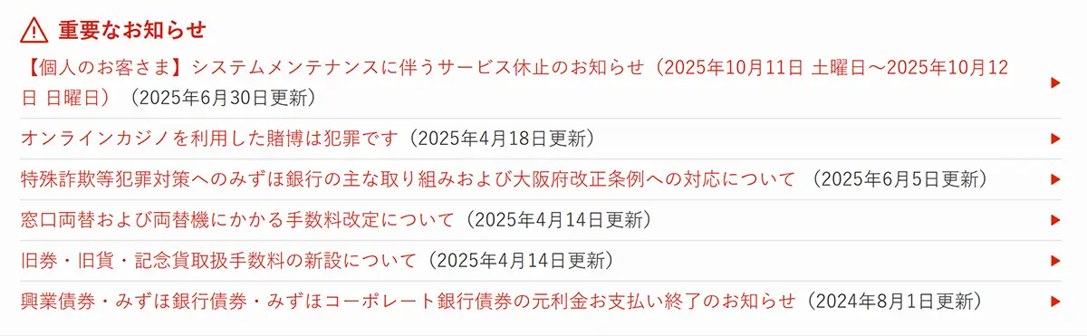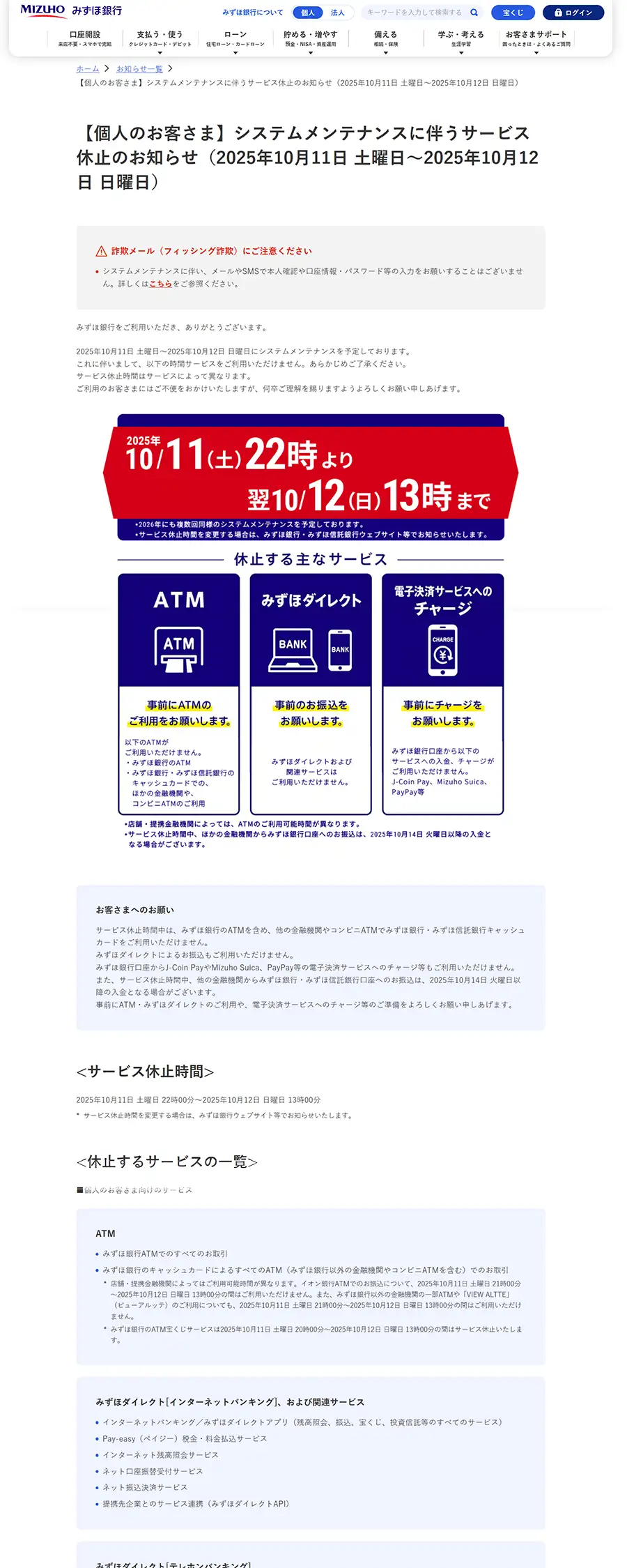 なお、このリストから選択してクリックして開く専用告知ページ https://www.mizuhobank.co.jp/oshirase/maintenance_personal.html では、まずまずわかりやすさと情報の充実さがあるといえる。