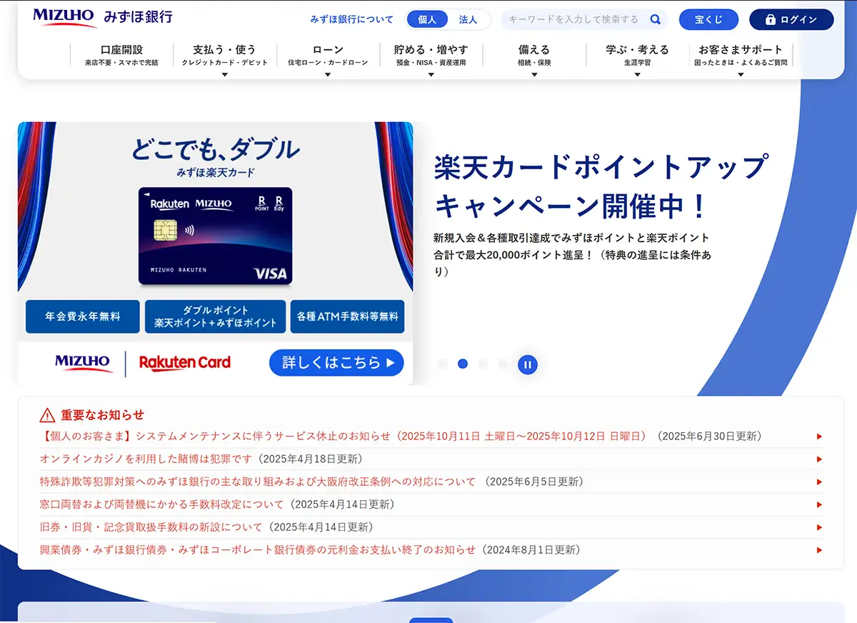 これは動画の表示画面に表示される広告で、15秒程の動画だが、最短5秒でスキップされてしまう。それでは、実際のウェブサイト https://www.mizuhobank.co.jp/index.html はどうなっているのか見てみた。