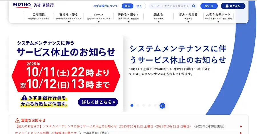 4枚がくるくる変わるバナーが5枚に増え、サービス休止の告知が追加されていた。トップページの表示は遅くとも10月1日からだろうと思っていたけど。また、みずほ銀行を名乗る詐欺メールが多いとしても利用者にメールでもう一度しつこく告知してもよいのにな、とも思わなくない。